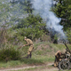 Реконструкция событий сентября 1943 года началась с сигнальной ракеты и имитации артподготовки. Признаться, пиротехники постарались на славу. Взрывы пугали по-настоящему, заряды были даже в воде. «Немцы» отвечали огнем из миномета и пулеметов. Наших же солдат, чуть позже, поддержала «сорокопятка», привезенная к месту боя лендлизовским джипом, и миномет, установленный в мотоциклетной коляске. После пятнадцатиминутной перестрелки, бойцы РККА, чуть ли не в рукопашную, взяли высотку, на которой располагались позиции «немцев», и, к искренней радости зрителей, водрузили на ней красное знамя.