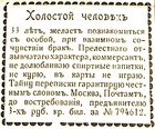 «Мне тридцать лет, шатен. Среднего роста, имею 20.000 годового дохода, желал бы познакомиться с хорошенькой женщиной. Бывать в театрах, прокатиться за город в лучшую морозную ночь, а затем согреться за стаканом вина. После же серьезного изучения друг друга я не против вступить в брак и предложить избраннице все удовольствия жизни. Москва, главный почтамт, предъявителю кредитного билета 100 р. Д. Я. 117396».