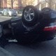Столкнулось 3 легковых автомобиля. У одного из автомобилей повреждена боковая часть, у другого - задний бампер. Неподалеку на обочине колесами вверх лежит третья легковая машина. Удар при перевороте пришелся на лобовое стекло.