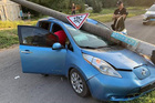 Утром 24 августа в Каменском на улице Матросова электрокар Nissan Leaf службы такси Volt врезался в принадлежащую облэнерго электроопору.