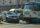 Трамвай врезался во внедорожник, образовалась пробка. Пострадавших нет.