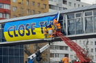17 марта на надземным переходом над Слобожанским проспектом появился баннер с призывом закрыть небо надо Украиной.