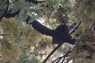 Кошка сидела на дереве на уровне 3-го этажа дома.